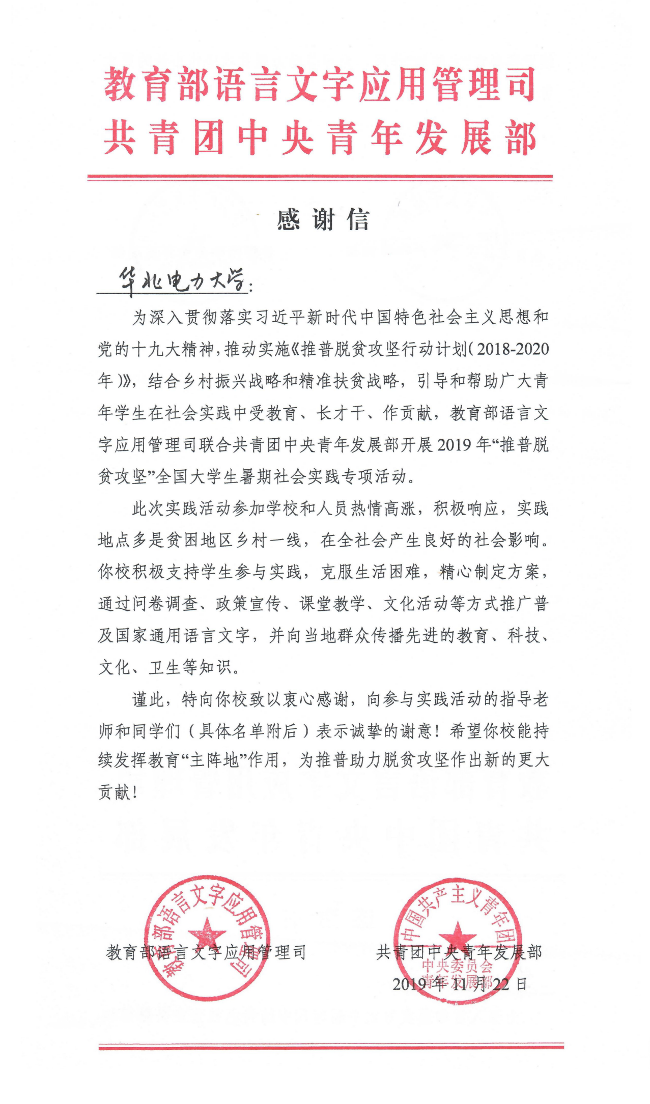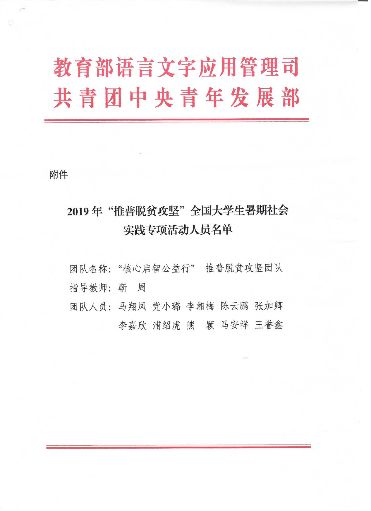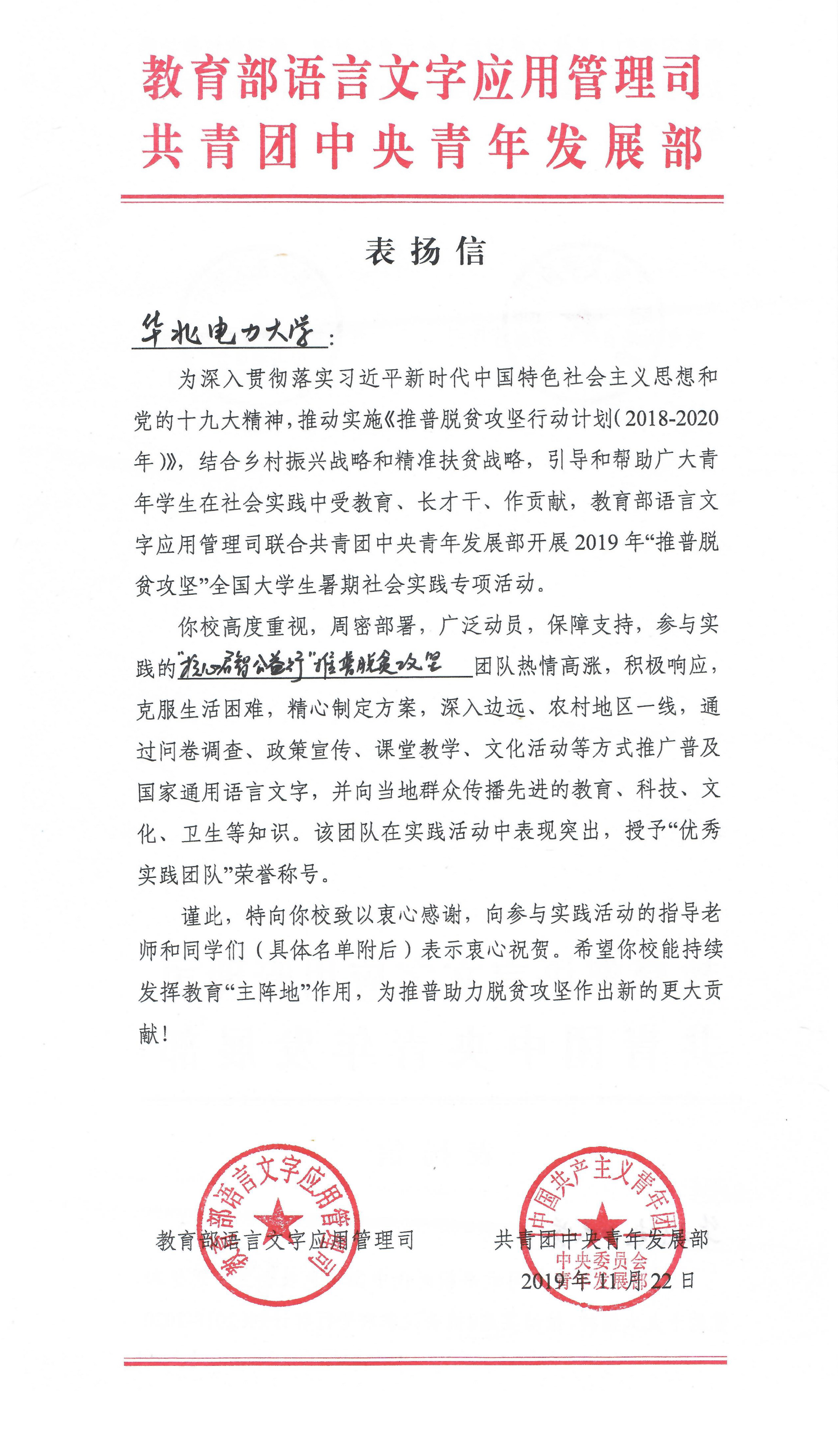 近日,教育部语言文字应用管理司、共青团中央青年发展部给吃瓜网 发来感谢信和表扬信,书面感谢和表扬了吃瓜网 组建的“核心启智公益行”推普脱贫攻坚社会实践队。表扬信中,教育部和团中央授予“核心启智公益行”推普脱贫攻坚社会实践队“全国优秀实践团队”荣誉称号。