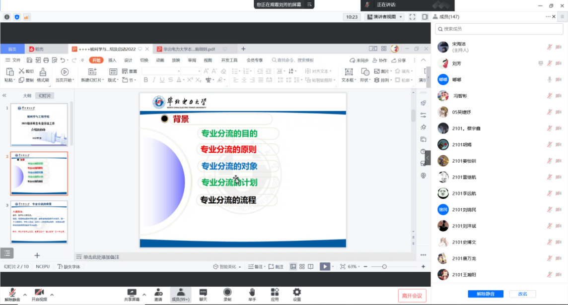首先,刘芳从专业分流的目的、原则、对象、计划和流程五个方面详细地介绍了此次专业分流工作实施办法。她强调,专业分流将遵循志愿优先、择优选拔的原则进行,希望同学们综合个人兴趣,统筹职业规划与人生目标等方面进行全方面思考,做出合理的选择。