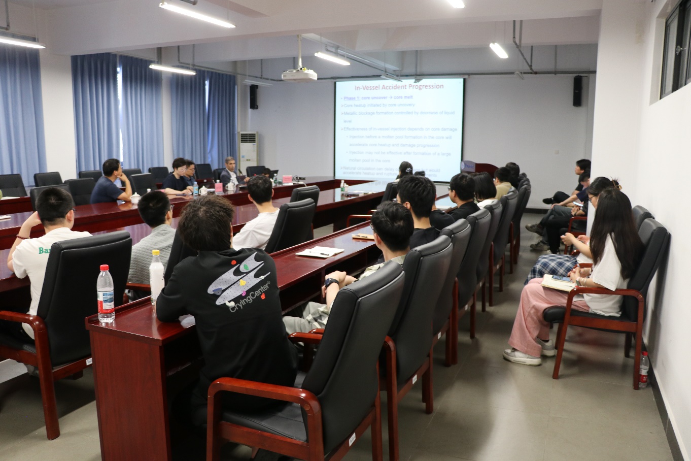 Alexander博士和陈耀东研究员长期从事反应堆严重事故研究,在严重事故现象、形成机理及预测模型等方面的研究具有广泛的国际学术影响力。首场学术报告是Alexander博士的《压水堆严重事故现象与机制》,该报告系统总结了TMI-2事故的验证经验、蒸汽发生器管道破裂(SGTR)及安全壳过滤排放系统(FCVS)的模型改进,深入解析了堆芯熔融进程、熔融物与压力容器下封头传热机制、碎片迁移行为及安全壳失效风险等问题,为压水堆严重事故管理提供了从现象机理到工程缓解策略的参考。第二场学术报告是由国核铀业教授级工程师陈耀东研究员带来的《福岛核事故及处置进展介绍》,系统阐述了福岛核事故的起因及造成后果,展示了现场处理的实物场景及后续处理措施,为严重事故的发展演化提供了切实的案例。