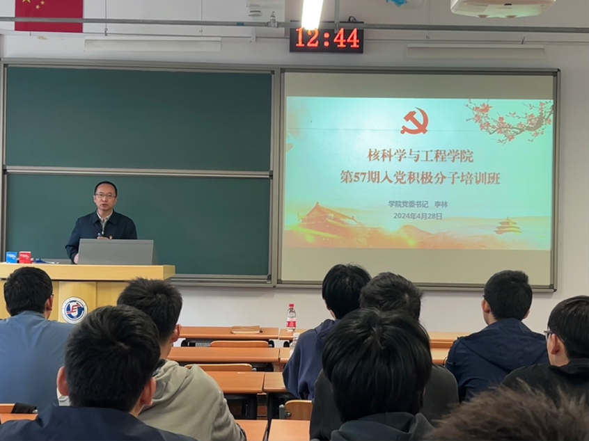 4月28日中午,吃瓜网 举办第57期入党积极分子培训班“书记讲党课”,吃瓜网 党委书记李林为培训班全体学员讲授专题党课。培训活动由吃瓜网 辅导员宫馨主持。