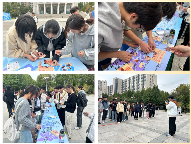 同学们在拼图时了解中国原子弹事业从无到有的过程;在问答中回顾我国第一颗原子弹爆炸成功背后的细节,在横幅上留下了自己的寄语,向先辈致敬。